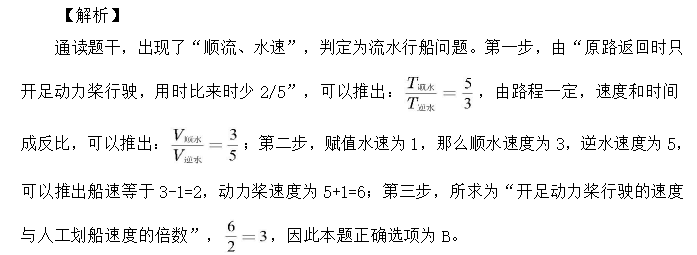【例 5】一只装有动力桨的船,其单靠人工划船顺流而下的速度是水速的 3 倍。现该船靠人工划动从 A 地顺流到达 B 地,原路返回时只开足动力桨行驶,用时比来时少 2/5。问船在静水中开足动力桨行驶的速度是人工划船速度的多少倍:
