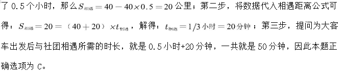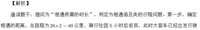 【例 6】寒假第一天,骑行社团从学校出发去滑雪,他们以 20 公里/小时的速度骑行 2个小时到达滑雪场,游玩 4 个小时后按原路以原速返回。骑行社团离开学校 5.5 小时后,辅导员派大客车以 40 公里/小时的速度沿相同路线迎接骑行社团,则大客车出发后与骑行社团相遇需要的时长是: